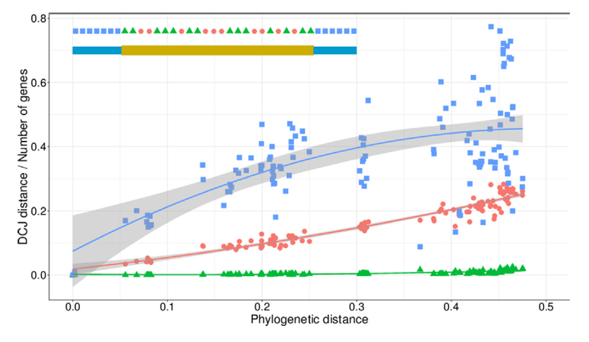 Ce travail collaboratif (Doctorat I2BC/Dynamic de JN Lorenzi) a permis, par une large analyse de génomique comparée au sein du genre Streptomyces, de démontrer que les régions terminales du chromosome évoluent de façon plus rapide sous l’effet combiné de la recombinaison (shuffling) et du transfert horizontal. Ces deux paramètres étant analysés dans des comparaisons génomiques bi-partites de l’indice de conservation de l’ordre des gènes (GOC local) et de la mesure du taux d’orthologues le long du chromosome (OR). Une analyse DCJ (Double Cut and Join) permet également d’inférer l’existence d’un squelette ‘rigide’ ancestral (core génome hérité de façon verticale) structurant la région centrale du génome.