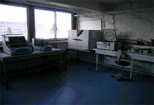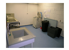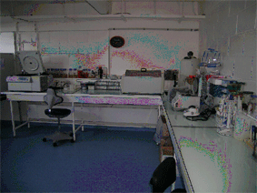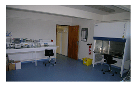 The floor is covered with as a bacteriostatic and antifungal PVC surface, and benches can easily be decontaminated. An airlock equiped with an autoclave, a locker, and a washing station communicate with the containment lab.